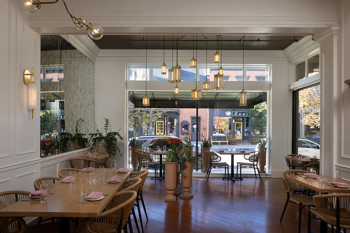 The renovation focused on reconfiguring the space to meet a comprehensive program that included improved kitchen and back-of-house circulation, the addition of a dumbwaiter to the lower-level wine bar, and the relocation of the existing bar.