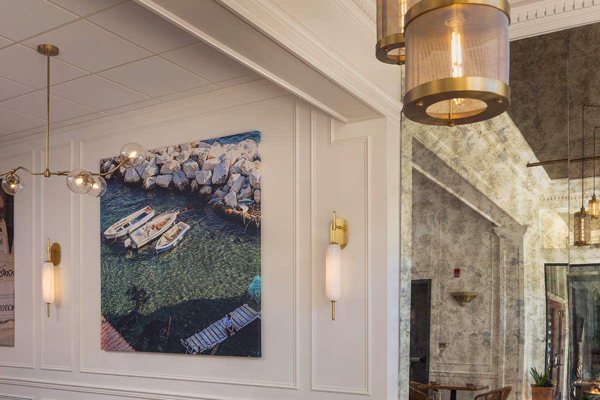 through clean lines, decorative trim molding, and neutral wall tones. Large custom artwork depicting Southern Italian scenes and Sicilian Moor ceramics bring warmth and cultural depth. Gold accents throughout the space add a touch of sophistication.